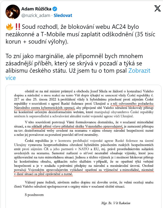 Ružička však k príspevku pripojil aj list ministra vnútra Víta Rakušana z 1. marca 2022, ktorý podľa neho dokladá, že štát v tom čase sám označoval blokovanie webov za „oprávnené a nutné“. „Len aby ste videli, ako vyzerá taká ‚nezáväzná proklamácia', kde hovorí o požiadavke NCKO odvodenej z vyhlásenia vlády, priamej výzve Vojenského spravodajstva k zamedzeniu prístupu a o vládnom opatrení," diskredituje Fialovu vládu redaktor Echo24.