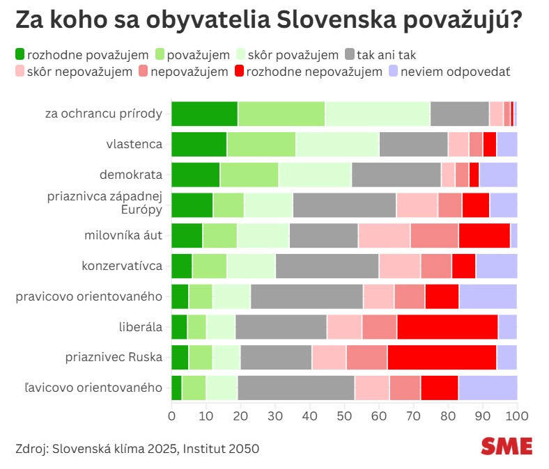 Z neho vidno, že za ochrancov prírody sa na Slovensku považuje 74 percent ľudí - oveľa viac, ako sa ich považuje za demokratov, vlastencov, priaznivcov západnej Európy alebo príslušníkov hocijakej inej skupiny. Vyplýva to z výskumu Slovenská klíma 2025. Názor nemá pätina Slovákov a len osem percent o sebe povie, že im to nie je blízke.