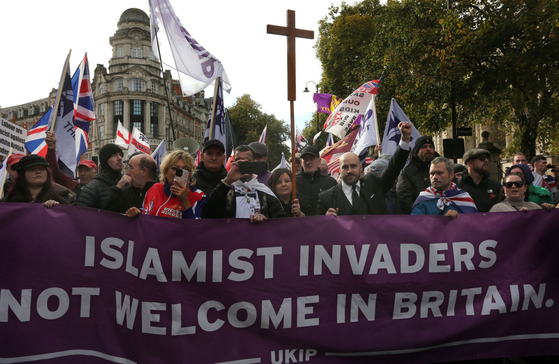 Demonštranti mávali palestínskymi a bangladéšskymi vlajkami, keď oslavovali zákaz protestu organizovaným populistickou Stranou nezávislosti Spojeného kráľovstva (UKIP) Metropolitnou políciou, ktorej líder Nick Marcel Tenconi označil za začiatok „križiackej výpravy“ proti islamistom a komunistom v Británii.