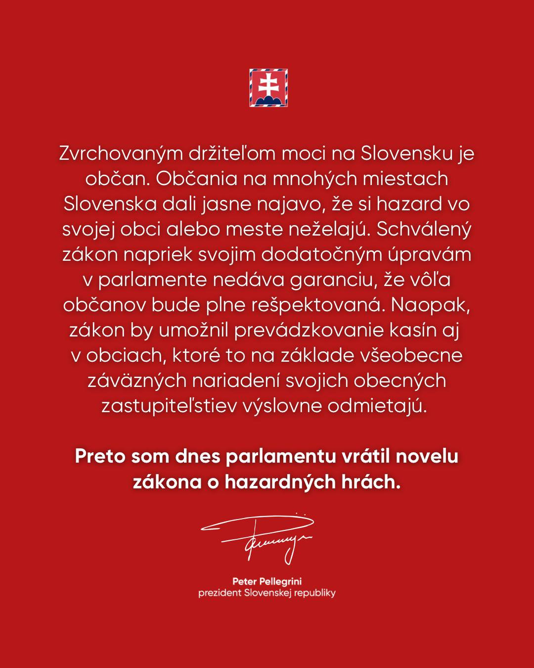 Prezident SR Peter Pellegrini v pondelok nepodpísal novelu zákona o hazardných hrách a vrátil ju Národnej rade (NR) SR na opätovné prerokovanie. Poslancom odporúča neprijať právnu normu ako celok. Hlava štátu považuje schválenú novelu za neprípustný zásah do ústavného práva na územnú samosprávu, autonómiu obcí, miest a ich výkonu verejnej moci, vrátane dodržiavania princípu právnej istoty.