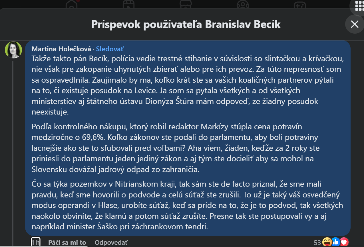 Spokojný je s tým, že jej posledný hoax polícia vyvrátila. „Zlá správa je, že tých lživých výrokov je nepomerne viac - a pri pohľade na absolútny nedostatok pokory pani Holečkovej, budú zjavne pribúdať,“ uzavrel Becík. Pod jeho statusom sa vyjadrila aj samotná poslankyňa, ktorá sa drží „zlatého pravidla – zatĺkať, zatĺkať, zatĺkať.