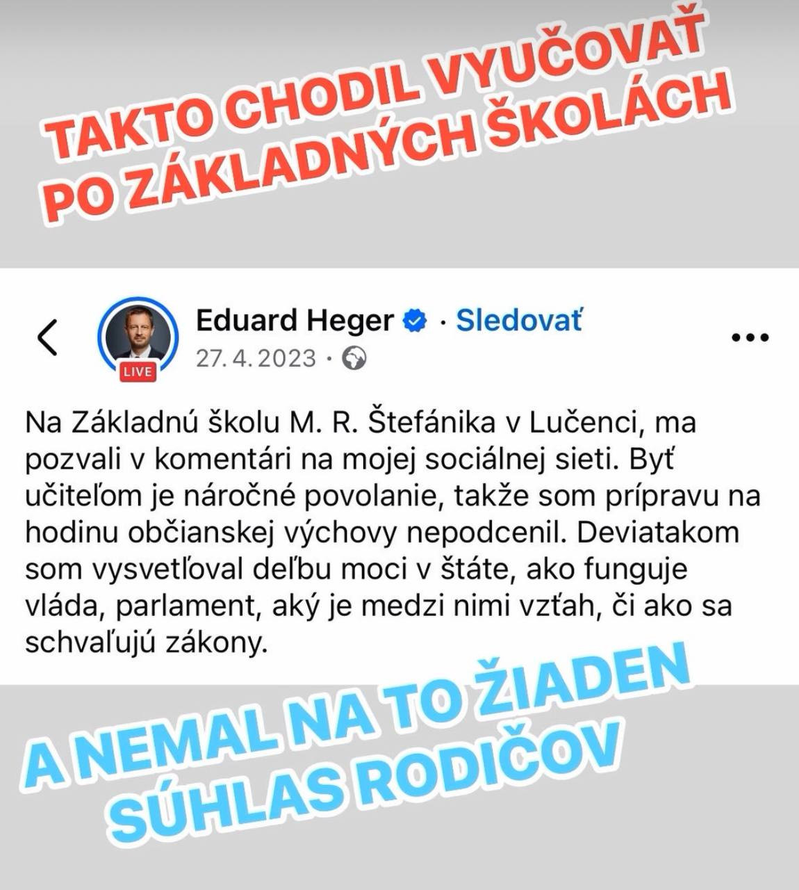 „Takto chodil vyučovať po základných školách a nemal na to žiaden súhlas rodičov,“ upozorňuje Tomáš Taraba pripomínajúc status Eduarda Hegera z apríla 2023 počas niekoľkomesačného padania vlády.