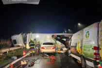 Vodič kamióna s návesom z nezistených príčin prerazil stredové zvodidlá a prešiel do protismernej časti diaľnice, kde sa vozidlo prevrátilo a skrížilo cestu cez oba jazdné pruhy v smere na Žilinu. Do prevráteného návesu narazila dodávka a tiež osobné auto.