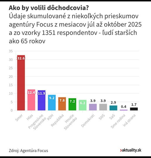 Prieskum vychádza z dát zbieraných od júla do októbra 2025 na vzorke 1 351 respondentov v dôchodkovom veku. Ak by sa volebné miestnosti otvorili len pre seniorov, Smer-SD by získal až 32,6 % hlasov – prakticky každý tretí dôchodca by volil Roberta Fica. Na druhom mieste by s výrazným odstupom skončil koaličný Hlas-SD so ziskom 12,4 %, čo je síce solídny výsledok, ale oproti lídrovi je len slabým tieňom.