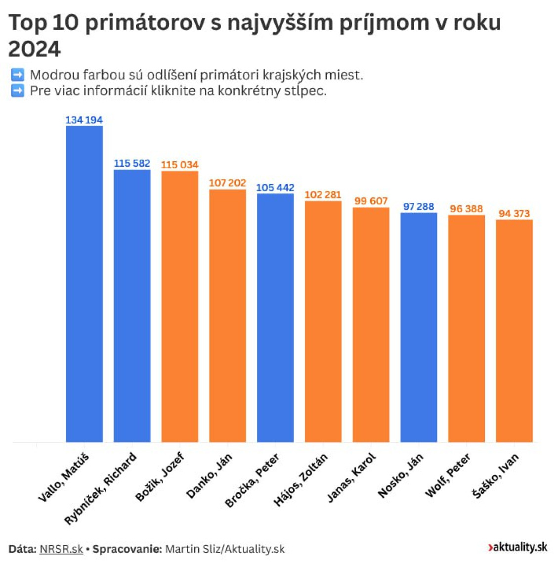 Prijmy verejne činných osôb sú verejnosťou ostro sledované. Nie o všetkých ale vie. Kým o platoch poslancov, či členov vlády ľudia určitú predstavu majú, príjmy primátorov sú častokrát zahalené rúškom tajomstva. Aktuality spravili prehľad platov šéfov samospráv. To, že najvyšší príjem ná bratislavský primátor Matúš Vallo asi nikoho neprekvapí... Čo zrejme prekvapí, že najlepšie zarábajúci primátor pôsobí v regióne, ktorý bol v minulosti považovaný za jeden z najchudobnejších.