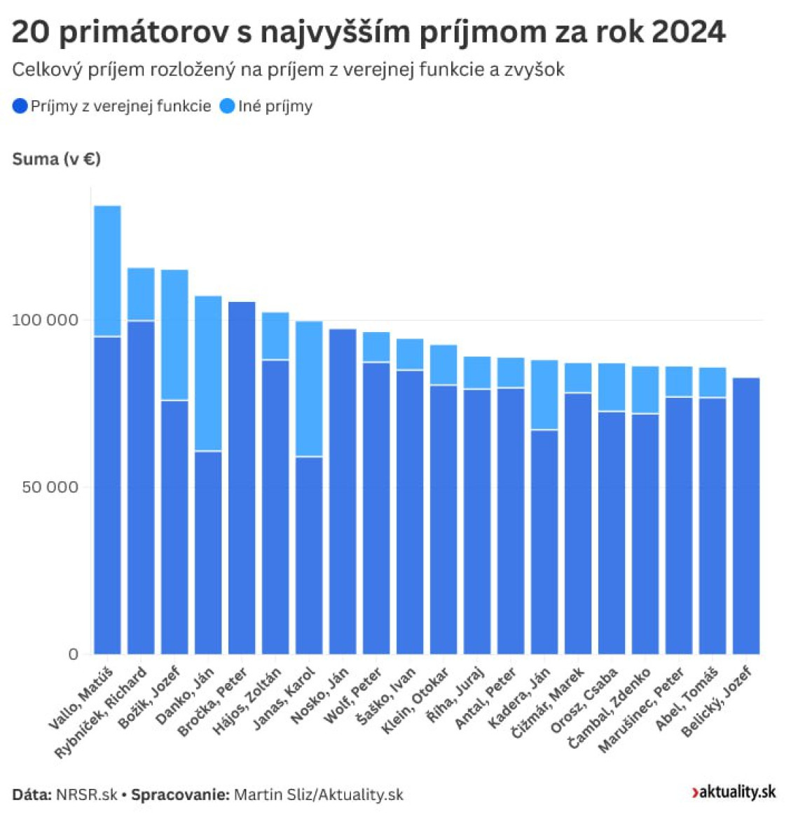 Na tretej priečke je predseda Združenia miest a obcí Slovenska (ZMOS). Jeho príjem bol v minulom roku 115.034 eur. Aj u neho tento výsledok „robia“ iné prijmy. „V tých iných príjmoch je odmena poslanca Trenčianskeho samosprávneho kraja, ktorá činí 9-tisíc eur v hrubom s tým, že tú odmenu od roku 2011 komplet odovzdávam. Ďalej tam je 2 500 eur, čo dostávam za to, že učím ako vysokoškolský pedagóg. Potom je tam odmena za funkciu predsedu sektorových rád, to je 18-tisíc eur ročne. A zvyšok je odmena člena rady Fondu na podporu športu,” objasnil Božík s tým, že po zdanení mu zostalo 74-tisíc eur. Štvrtý Peter Bročka z Trnavy priznal 105-tisíc eur a Ján Nosko z Banskej Bystrice na piatom mieste mal príjem 97-tisíc eur. V prvej desiatke nájdete aj primátorov Dunajskej Stredy, či Dubnice nad Váhom. Iné príjmy pritom nemajú len Vallo či Božík. Primátori popri verejnej funkcii zarábajú aj inde. Primátor Martina Ján Danko imo verejnej funkcie ako lekár zarobil 46.408 eur, za ním nasleduje šéf považskobystrickej radnice Karol Janas so 40-timi tisícmi eur. Vallo je „až“ za ním.