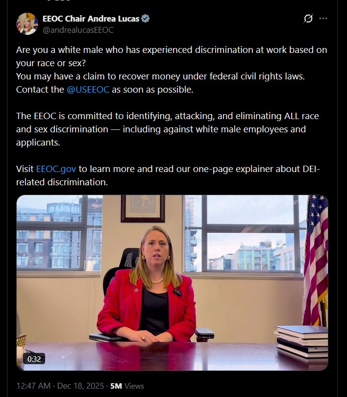Kampaň o pracovnej diskriminácii otvorila Andrea Lucasová – úradujúca predsedníčka Komisie pre rovnosť príležitosti v zamestnaní (EEOC) tento týždeň. Komisia EEOC bola vytvorená na základe zákona o občianskych právach z roku 1964, má za úlohu riešiť diskrimináciu na základe rasy a pohlavia v zamestnaní. Tradične sa agentúra zameriavala na ochranu skupín, ako sú černosi a ženy. Dnes povzbudzuje bielych mužov, aby odvážne nahlasovali prípady diskriminácie na pracovisku: Na sociálnej sieti X uverejnila otázku "Ste biely muž, ktorý zažil diskrimináciu v práci na základe rasy alebo pohlavia?"