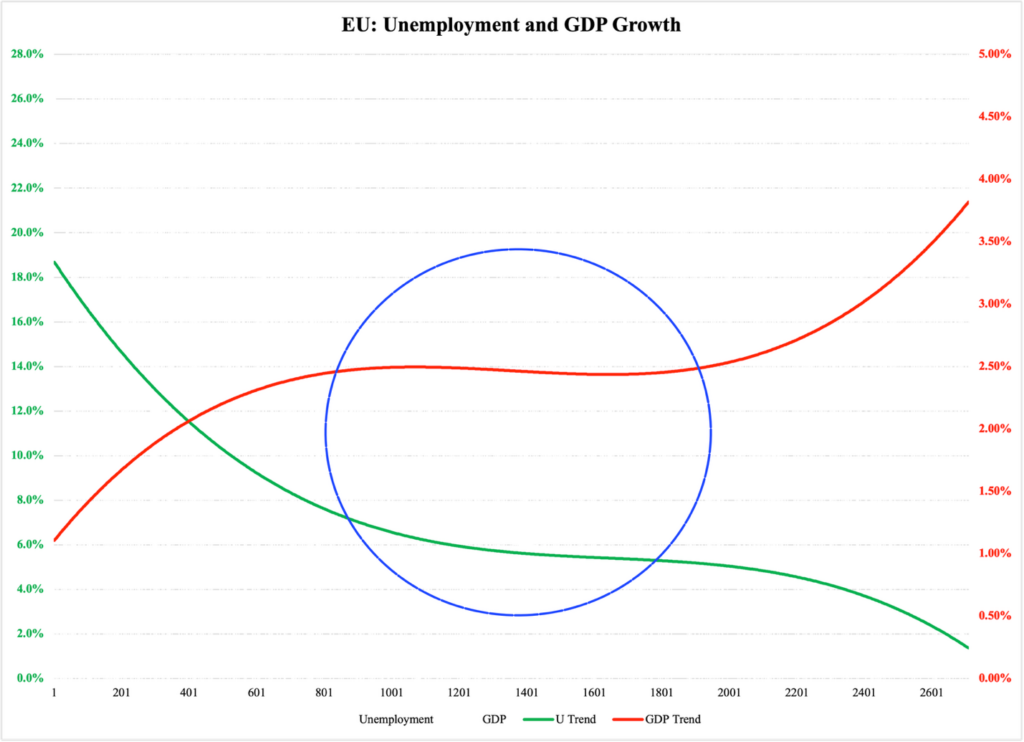 Toto číslo je založené na relatívne starých údajoch; novší výskum naznačuje, že tento „bod zlomu“ je vyšší, pravdepodobne bližšie k 3 % rastu ročne. V každom prípade je vyšší, ako sa v Európe očakáva v dohľadnej budúcnosti. To znamená, že aj pri vyššom využití svojej pracovnej sily je Európa v smutnom stave stagnácie. Dôsledky sú hrozivé: