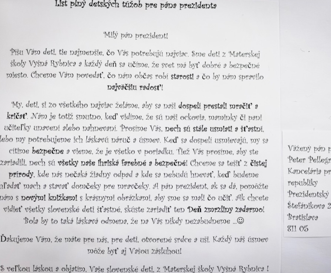„Zaujalo ma, že sa deti snažia hľadať na našej krásnej krajine to dobré a želajú si, aby sme sa tak správali aj my, dospelí. Zoberme si ich želania k srdcu a nahraďme nenávisť pozitívnym myslením. Slovensko tak bude lepším miestom pre život," apeloval prezident.