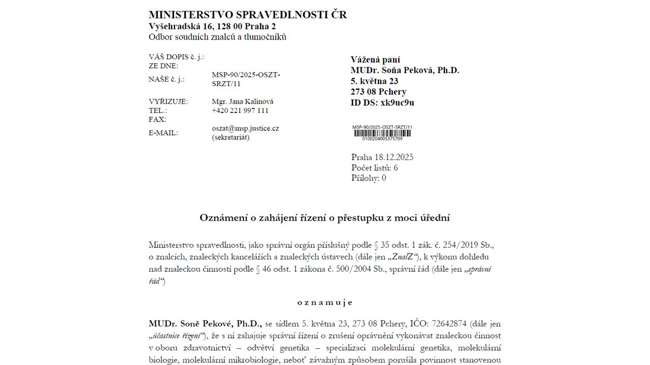 "18. decembra 2025 mi do dátovej schránky prišiel dokument z Ministerstva spravodlivosti ČR, MSP-90/2025-OSZT-SRZT/11, kde mi pán Mgr. Radomír Čujan, LL.M, riaditeľ odboru súdnych znalcov a tlmočníkov oznamuje, že so mnou bolo začaté konanie o priestupku z úradnej moci.