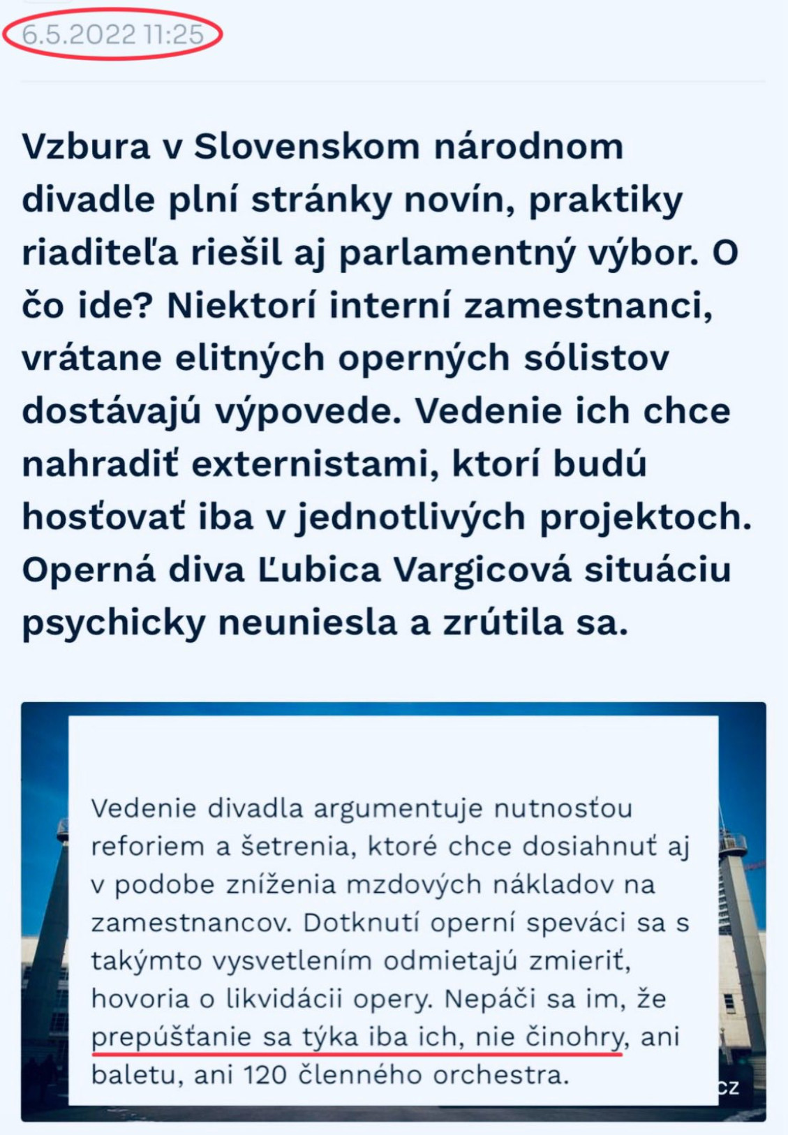 Za bývalej vlády vyhodil vtedajší generálny riaditeľ Slovenského národného divadla Matej Drlička 146 zamestnancov Opery SND. Ani slovom sa ich nezastali. Mlčali aj vtedy, keď "neviditeľná" ministerka kultúry Natália Milanová finančne doslova ruinovala svoj rezort. Nikdy ste od nich nepočuli ani slovo solidarity s prepustenými ľuďmi, ktorí boli za minulej vlády vyhadzovaní z politických dôvodov v neporovnateľne masovejšom meradle, konštatuje politológ Eduard Chmelár.