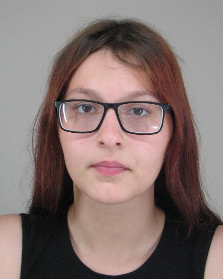 Popis: vysoká 160 cm, štíhla postava, hnedé gaštanové vlasy (momentálne prefarbené na červeno), hnedé oči, nosí dioptrické okuliare s čiernym rámom Oblečenie: zimná bunda fialovej farby s kožušinovým golierom, tenisky bielej farby so šedými pruhmi, na hlave čiapka svetlo hnedej farby s brmbolcom