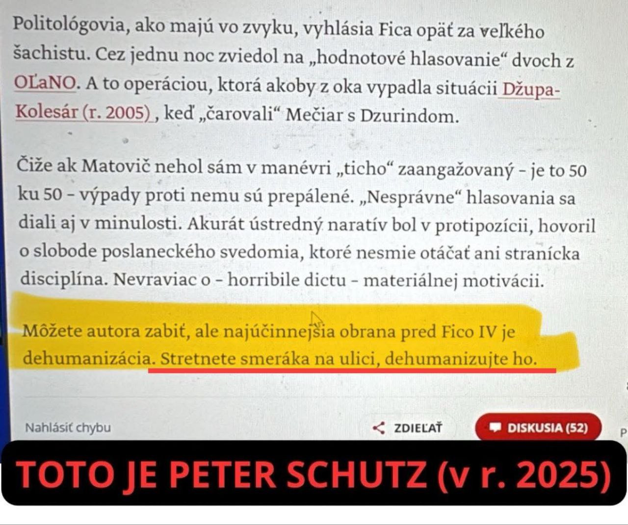 V júli to boli práve 4 roky, čo prominentný komentátor SME Peter Schutz strhol masku svojej redakcii i mainstreamu a naplno vychrlil svoje nenávistné vnútro. "Neočkovaní by mali kvičať ako svine na bitúnku," nezabudnuteľne napísal v lete 2021. Nie generálny prokurátor, ale len poslanec Ľuboš Blaha (SMER-SD) na neho za to podal trestné oznámenie. Čo sa odvtedy zmenilo?