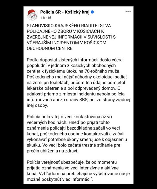 “Podľa doposiaľ zistených informácií došlo včera popoludní v jednom z košických obchodných centier k fyzickému útoku na 70-ročného muža. Poškodeného mal nájsť náhodný okoloidúci sedieť na zemi pri toaletách, pričom ten údajne odmietol lekárske ošetrenie a bol odprevadený domov. O udalosti priamo z miesta incidentu nebola polícia informovaná ani zo strany SBS, ani zo strany žiadnej inej osoby,” napísala košická polícia deň po údajnom útoku na sociálnej sieti.