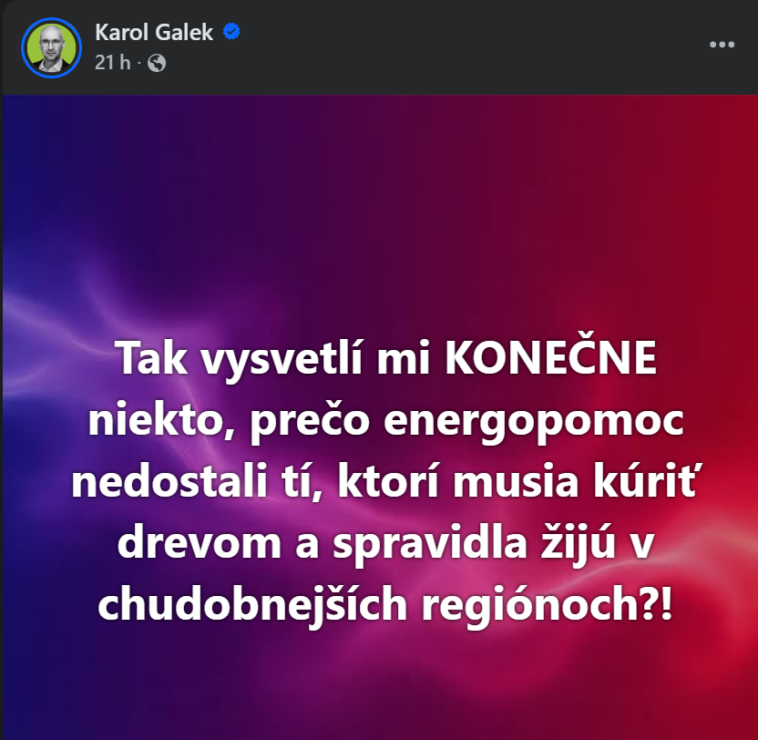 Na sociálnej sieti Karol Galek, bývalý štátny tajomník ministerstva hospodárstva v niekoľkých statusoch či videách kritizuje formu energopomoci akú zvolilo súčasné vedenie ministerstva hospodárstva.