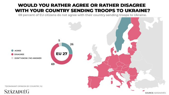 Podľa zistení prieskumu 69 % Európanov odmieta myšlienku vyslania vojakov na Ukrajinu, zatiaľ čo 51 % je proti dodávkam zbraní. Len 5% sa nevie vyjadriť. Najnovšie údaje naznačujú, že skepticizmus voči Bruselu sa stal dominantným postojom vo veľkej časti EÚ. Reagoval už hovorca maďarskej vlády Zoltán Kovács a na sieti X zdôraznil, že prieskum „odhaľuje jasný rozkol medzi Bruselom a európskymi občanmi v otázke vojny na Ukrajine“.