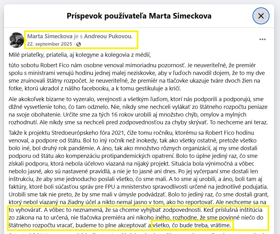 V septembri sa zistilo, že "slušnoľuďom" vôbec nesmrdia štátne podpory "Tejtokrajiny"a na ich získanie matka lídra opozície Michala Šimečku (Progresívne Slovensko) neváhala ani opakovane podvádzať. Jej rozprávky v stredu ukončilo rokovanie vlády, ktoré odobrilo výsledky auditu o neoprávnenom financovaní jej povestného "PROJEKTu FÓRUM". V septembri VEREJNE SĽÚBILA, že všetko vráti. Nestalo sa a miesto nápravy škody opäť len útočí. Progresívne médiá ohlušujúco mlčia.