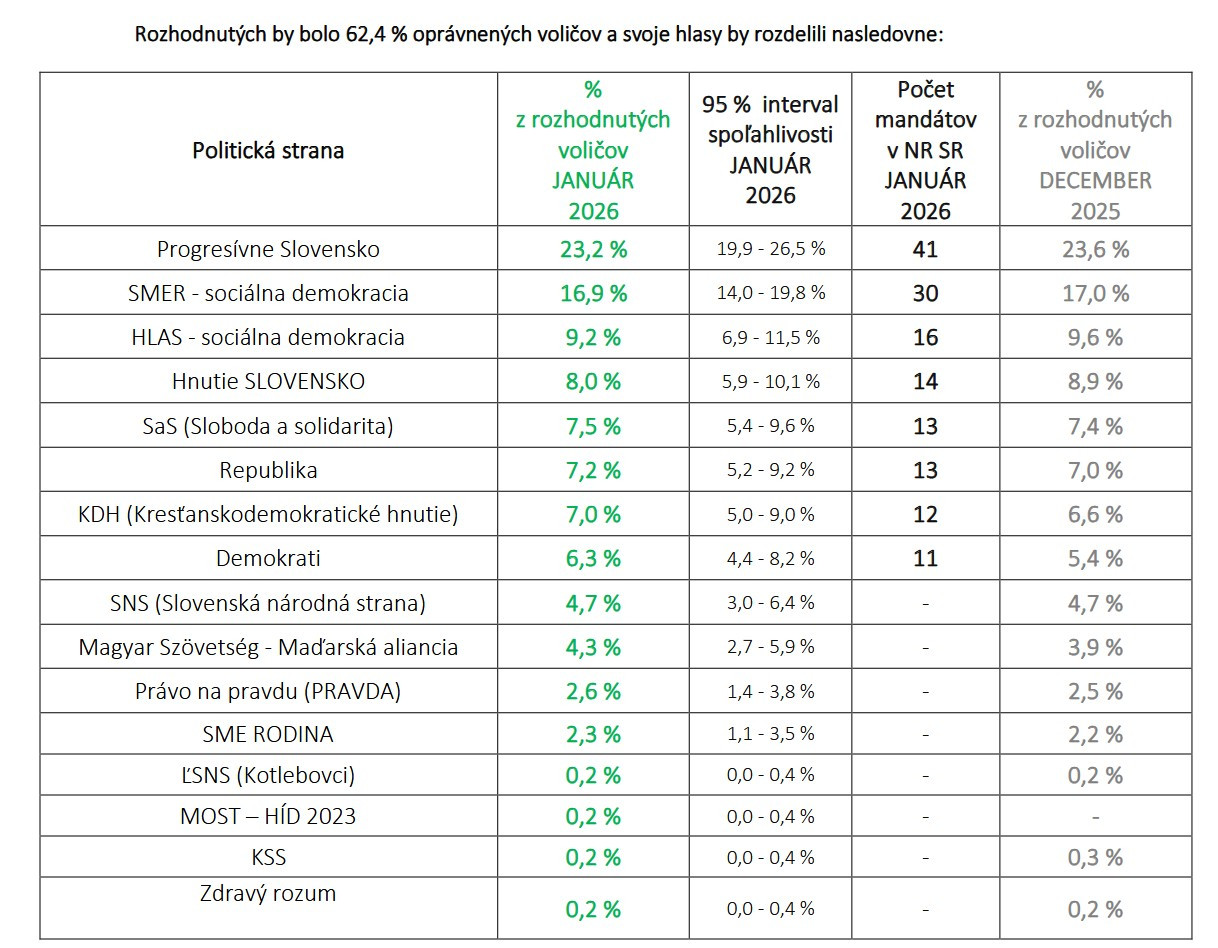 Ak by sa voľby konali v polovici januára, vyhralo by ich Progresívne Slovensko so ziskom 23,2 percenta hlasov. Podľa prieskumu AKO by ho s odstupom nasledoval Smer-SSD s 16,9 percenta hlasov. Tretím by bol Hlas-SD s 9,2 percentami hlasov, ktorý by tak vystriedal dlhobo usadenú Republiku.