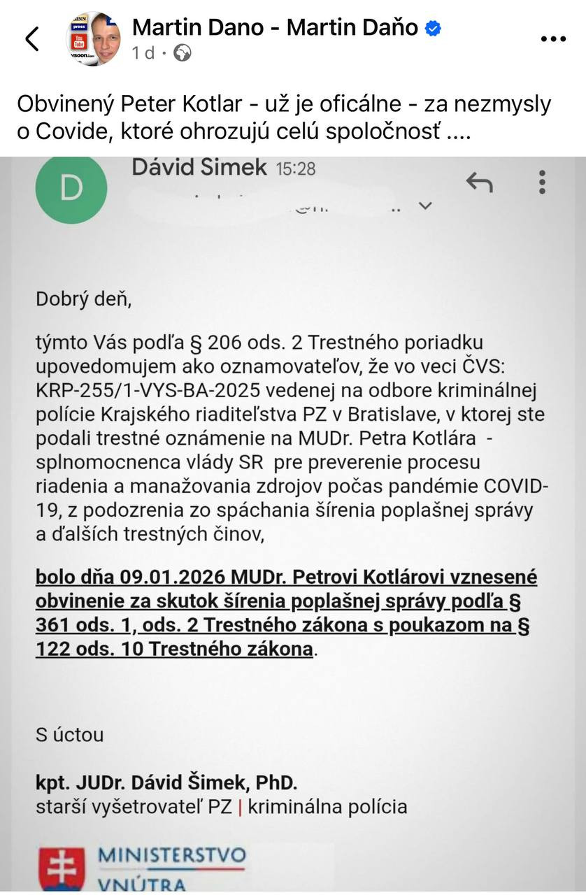 Výsledkom zúfalej nuly je však prekvapivý krok orgánov činných v trestnom konaní: vyšetrovateľ kpt. Dávid Šimek napísal a Daňo rád zverejnil, že "9. januára 2026 bolo proti vládnemu splnomocnencovi MUDr. Petrovi Kotlárovi vznesené obvinenie za skutok šírenia poplašnej správy podľa § 361 ods. 1, ods. 2 Trestného zákona." Upovedomuje o tom práve Daňa ako oznamovateľa, ktorý na poslanca Kotlára podal trestné oznámenie pre citovaný skutok: