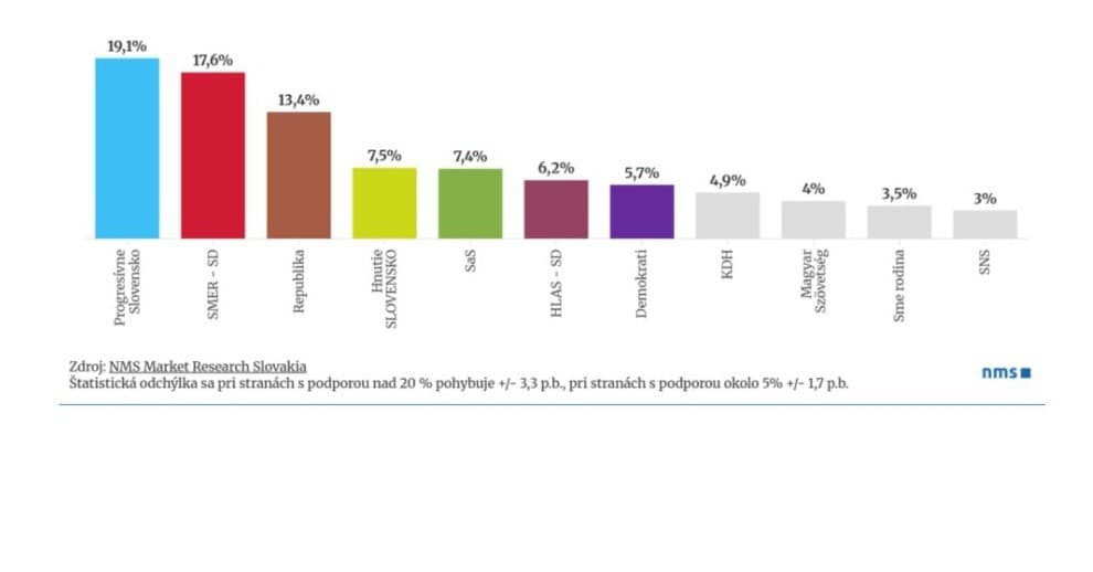 Možno prekvapí, že na čele sa napriek podvodnej kauze matky Šimečkovej stále drží Progresívne Slovensko s 19,1 percentami. Oproti januáru padlo o viac ako 1% a náskok pred druhým Smerom-SD so 17,6 percentami sa po dlhom čase výrazne znížil na 1,5%. Rekordne rastie aj mimoparlamentné hnutie Republika, a to na 13,4 percenta preferencií.