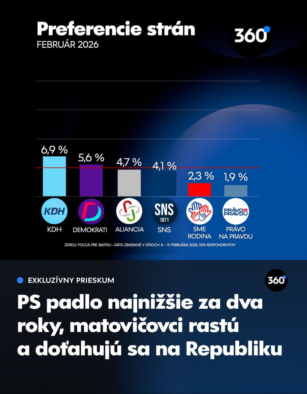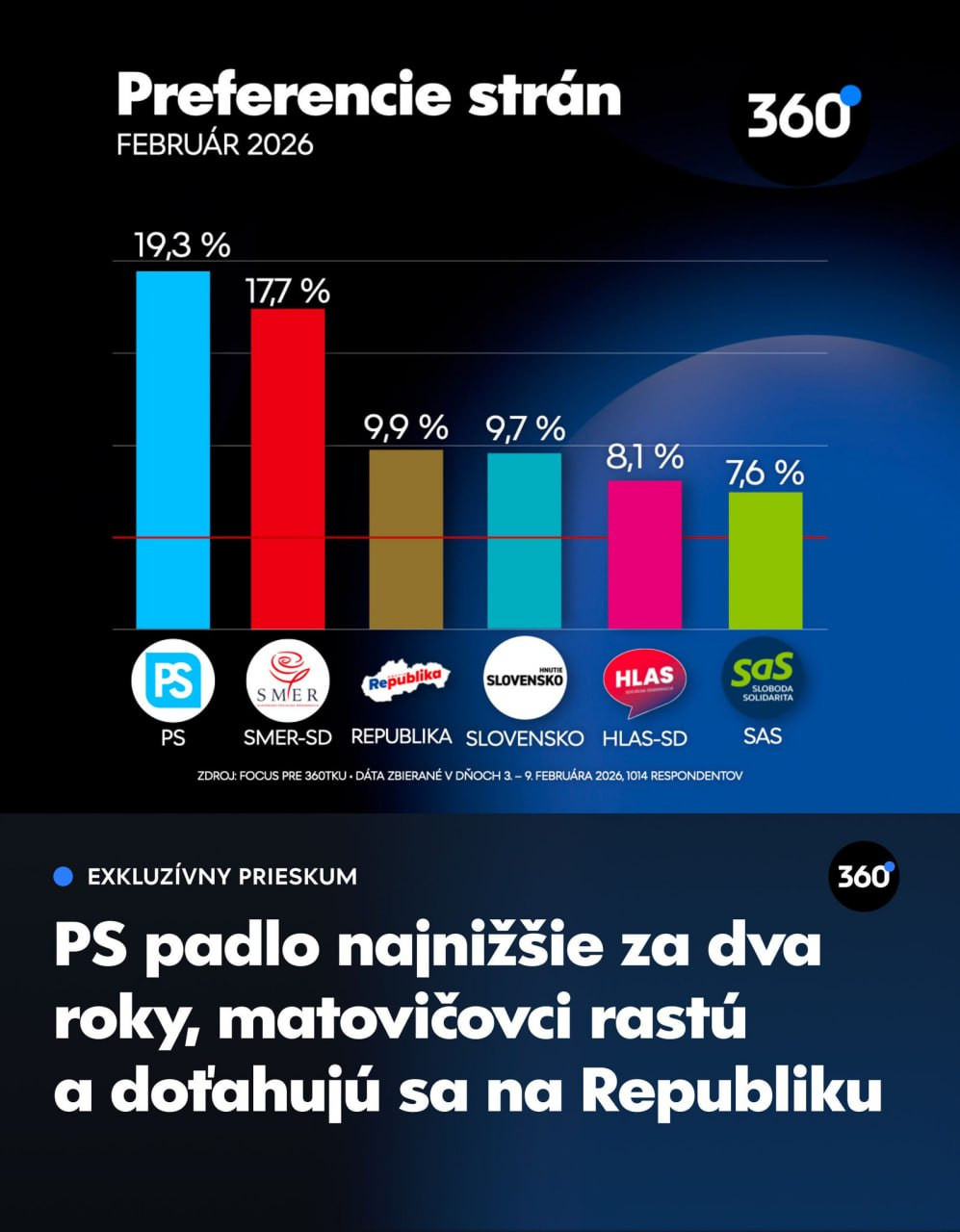 Ak by sa voľby do Národnej rady SR konali vo februári, vyhralo by ich Progresívne Slovensko (PS) so ziskom 19,3 percenta hlasov. Druhý by bol Smer-SD s podporou 17,7 percenta voličov. Vyplýva to z prieskumu agentúry Focus pre portál 360tka.