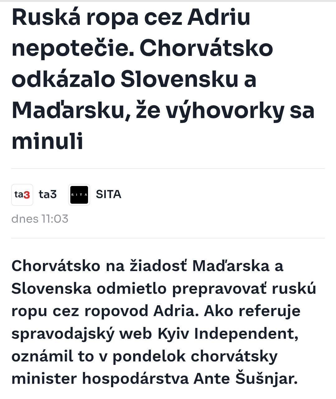 Obe krajiny požiadali Chorvátsko o pomoc s dodávkami ruskej ropy z obáv z bezprostredného nedostatku palív. Chorvátsky minister hospodárstva Ante Šušnjar však povedal, že sa tak nestane. „Ropa kúpená z Ruska sa môže niektorým krajinám zdať lacnejšia, ale pomáha financovať vojnu a útoky na ukrajinský ľud,“ uviedol Susnjar v príspevku na X. „Pre žiadnu krajinu EÚ už neexistujú žiadne technické výhovorky na to, aby zostala viazaná na ruskú ropu,“ povedal.