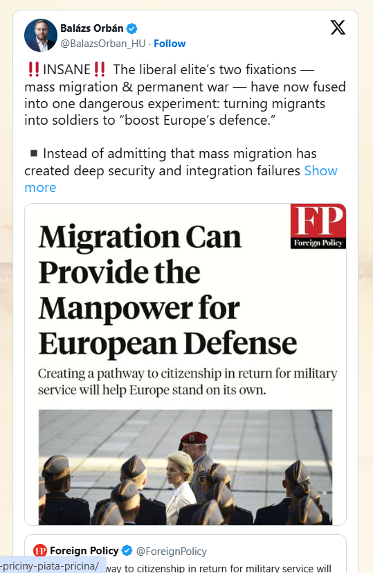 „Dve posadnutosti liberálnej elity – masová imigrácia a permanentná vojna – sa teraz zlúčili do jedného nebezpečného experimentu: premeniť imigrantov na vojakov, aby sa „posilnila obrana Európy“. Namiesto toho, aby priznali, že masová imigrácia spôsobila hlboké bezpečnostné a integračné zlyhania v celej Európe… Namiesto toho, aby uznali, že bezohľadná eskalácia posunula kontinent k dlhotrvajúcej nestabilite… Teraz navrhujú vyzbrojiť tých, ktorých predtým nedokázali integrovať. Maďarsko odmieta obe posadnutosti. Žiadne migračné kvóty. Žiadna vojnová agenda. Iba mier a bezpečnosť maďarského ľudu.“