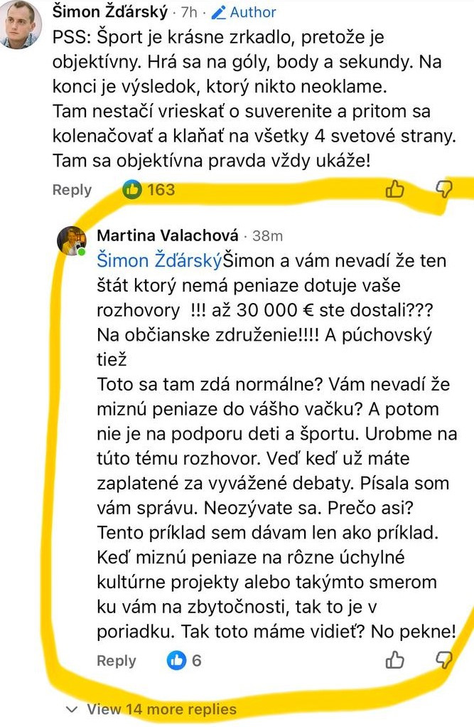 Napríklad František Oravec napísal toto: "Šport ako symbol úpadku krajiny? Nie. Skôr symbol toho, ako sa dá realita ohnúť, keď sa hodí do politického príbehu. Jedna olympiáda bez medaily nie je dôkaz úpadku štátu. Je to šport. Raz si hore, raz dole. Ale urobiť z toho obraz „hnijúcej krajiny“ je tak lacné a účelové. Porovnanie s Nórskom? V poriadku... Ale potom povedzme všetko. Nielen to, že tam majú medaily, ale aj to, že majú aj inú úroveň verejnej diskusie a novinárčiny. To už o hnijúcej slovenskej novinárčine ani slovo. Všetko tu hnije..no žurnalistika kvitne. Novinári tam neskladajú realitu tak, aby sedela do vopred pripraveného politického rámca ako aj tento status. Nepotrebujú z každej témy robiť dôkaz o tom, aká je krajina zlá, akí zlí a neschopní ľudia tam žijú. A rodičia financujú šport? Úúú. Vitajte v realite vrcholového športu kdekoľvek na svete. Obeta rodiny nie je slovenská výnimka, ale základ úspechu. Niekde financujú viac niekde menej. Na Slovensku to nie je ideálne. Ale celá rodina dáva do toho celý svoj život aj peniaze. Či už v Nórsku, USA alebo na Slovensku. Slovensko má veľké problémy bez diskusie. Ale tie problémy tu nie sú rok ani dve. Sú tu desaťročia. Zvaliť ich na Fica je folklór. Ak chceme hovoriť o úpadku, začnime aj pri sebe. Aj pri médiách. Lebo ak novinár namiesto hľadania pravdy podsúva jednostranný obraz ako emóciu ako fakt, svoju mienku ktorú máš mať aj ty inak si "dezolát" a treba ťa "dehumanizovať" a do toho všetkého vloží svoj subjektívny politický názor na vládu...tak neprispieva k riešeniu. Prispieva k rozkladu dôvery a spoločnosti. Slovensko nie je dokonalé. Ale ani tak beznádejné, ako ho niektorí potrebujú vykresliť..a zakopať pod čiernu zem."