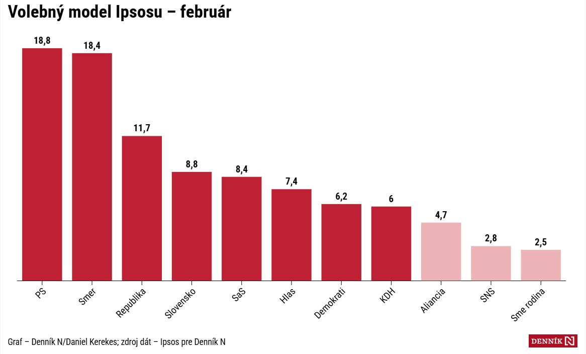 PS a Smer sa nachádzajú v rozostupe štatistickej chyby. Zvíťaziť by tak v reálnych voľbách mohla ktorákoľvek z týchto strán. Agentúra robila prieskum od 16. do 20. februára na vzorke 1 037 respondentov.