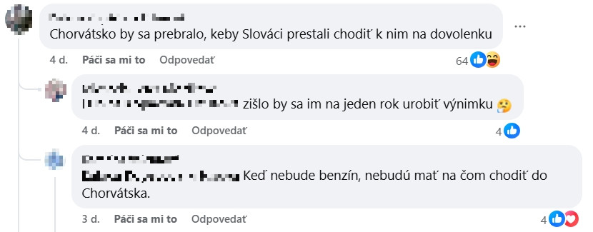 „Chorvátsko by sa prebralo, keby Slováci prestali chodiť k nim na dovolenku,“ napísala jedna z diskutujúcich. Ďalšia dodala, že by sa im zišlo urobiť aspoň ročnú výnimku. „Je to jednoduché. Oni nám neprepravia ropu, ani jeden Slovák nepôjde na dovolenku do Chorvátska,“ reagoval ďalší komentujúci. „Viac do Chorvátska nejdem,“ uviedol Ján.