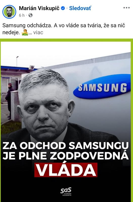 Je už naozaj nechutné, ako opozičné hyeny (lebo inak sa tieto deštruktívne sily nedajú nazvať) zneužívajú každú jednu situáciu na doslova zvrátené balamutenie ľudí. Od včera počúvame, že zatvorenie fabriky Samsung v Galante je "politická zodpovednosť Ficovej vlády" (Progresívne Slovensko), "dôsledok pobabranej konsolidácie" (Ľudovít Ódor), "priamym následkom zhoršujúceho sa podnikateľského prostredia" (KDH), "dôsledok zlých rozhodnutí vlády" (Viliam Karas), "výsledkom Ficových vysokých daní a odvodov" (Demokrati), "výsledkom pustošenia Slovenska Ficovou vládou" (Veronika Remišová) alebo dokonca "zradou slovenských záujmov zo strany Fica" (Michal Šimečka) atď. Skonštatoval to na sociálnej sieti historik a politický analytik Eduard Chmelár.