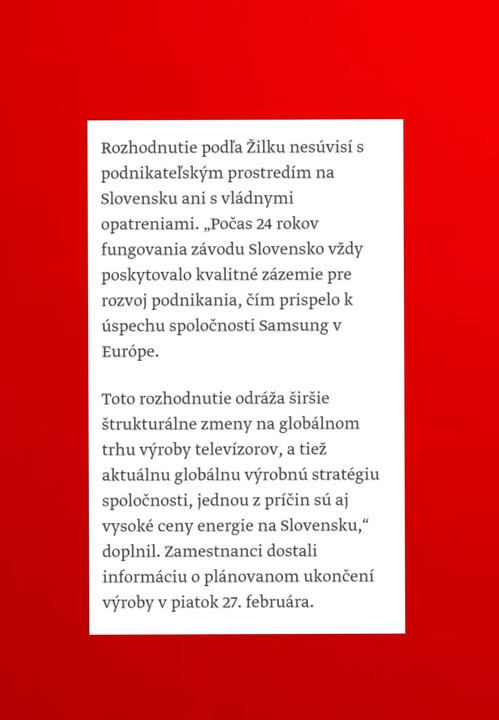 Všetci títo tragédi to dali na Matoviča a boli ešte takí amatéri, že si ani nepočkali na stanovisko Samsungu, ktorý všetky ich absurdné obvinenia spláchol ako použitý toaletný papier. Viceprezident firmy vyslovene zdôraznil, že tento krok nesúvisí ani s podnikateľským prostredím na Slovensku, ani so žiadnymi vládnymi opatreniami, ale je predovšetkým výsledkom vysokých cien energií. Naopak vyzdvihol, že Slovenská republika poskytla Samsungu kvalitné zázemie pre jeho rozvoj a rast.