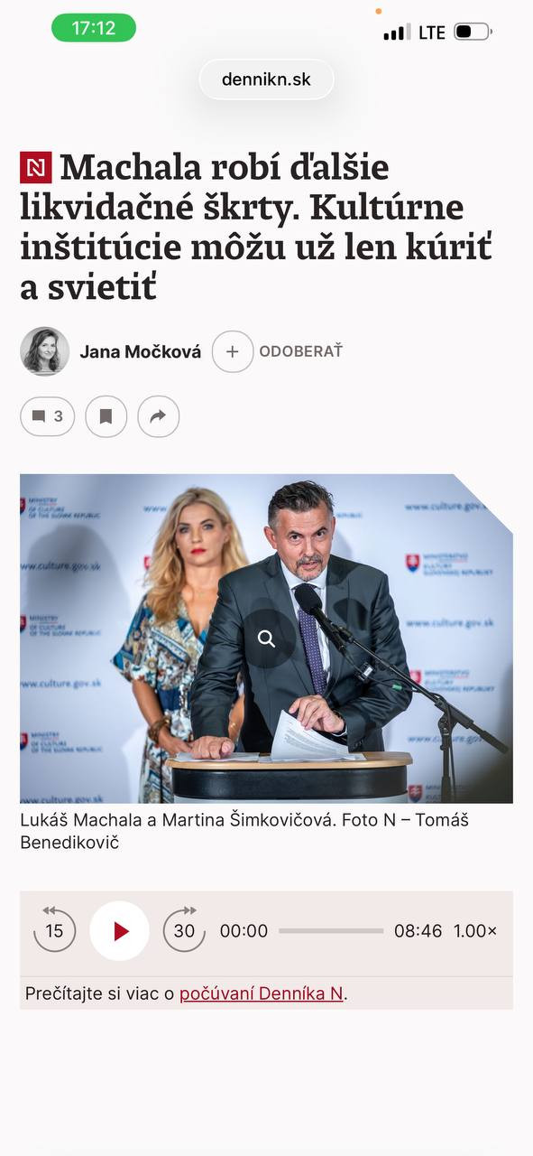 Frustrovaná opozícia sa všemožne snaží urýchliť parlamentné voľby: žalovaním v Bruseli, krojmi bratislavskej kaviarne i prvoplánovými lžami a osočovaním. Obľúbeným terčom je ministerka kultúry Martina Šimkovičová (SNS), ktorej robí garde generálny tajomník služobného úradu Lukáš Machala. Aj tentokrát na sociálnej sieti Telegram bez servítky bránil kroky ministerstva pred útokom progresívnych médií.
