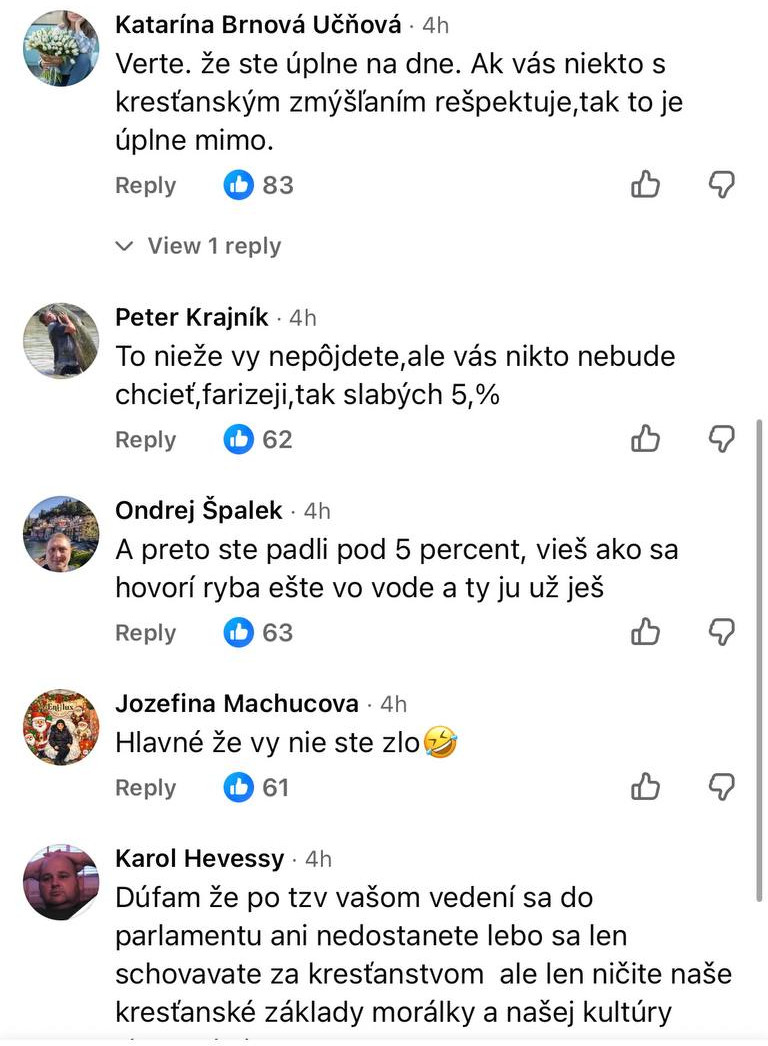 Aj Karolova obžaloba je tvrdá: "Dúfam, že po tzv. Vašom vedení sa do parlamentu ani nedostanete, lebo sa len schovávate za kresťanstvom, ale len ničíte naše kresťanské zásady morálky a našej kultúry." Väčšina diskutérov si všimla, že KDH už opakovane v prieskume volebných preferencií nedosiahlo ani 5%, potrebných na vstup do parlamentu: