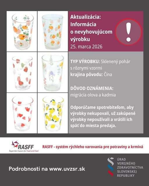 Dôvod? Nebezpečne vysoký obsah olova a kadmia v potlači na vonkajšej strane pohárov, ktorý presahuje povolené limity a predstavuje riziko pre zdravie. Úrad verejného zdravotníctva SR spolu s regionálnymi úradmi už overuje, či sa tieto výrobky predávajú aj u nás.