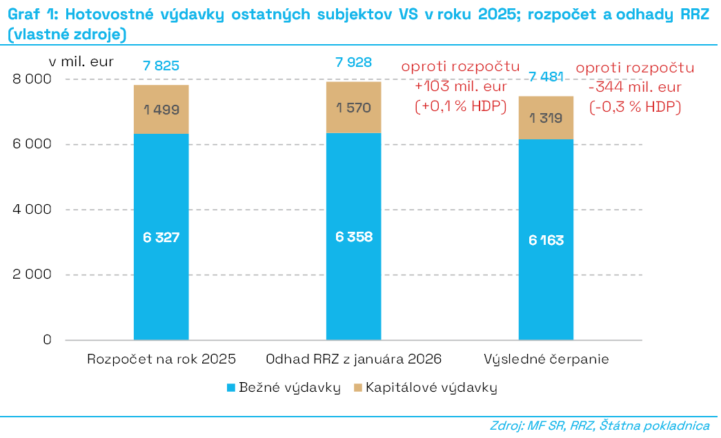 „Odhady RRZ pritom ešte v januári 2026 naznačovali, že výdavky mierne prekročia plán. Namiesto toho však vznikla úspora 344 miliónov eur (0,3 percenta HDP). V porovnaní s januárovou prognózou RRZ, ktorá odhadovala deficit podobne ako MF SR vo výške 5,0 percenta HDP, sú výdavky nižšie až o 446 miliónov eur,“ uvádza RRZ. Napriek tomu analytici upozorňujú, že ide skôr o jednorazový efekt. „Pozitívny vplyv hospodárenia týchto subjektov síce znižuje deficit, no nemá trvalý charakter,“ upozorňuje RRZ.