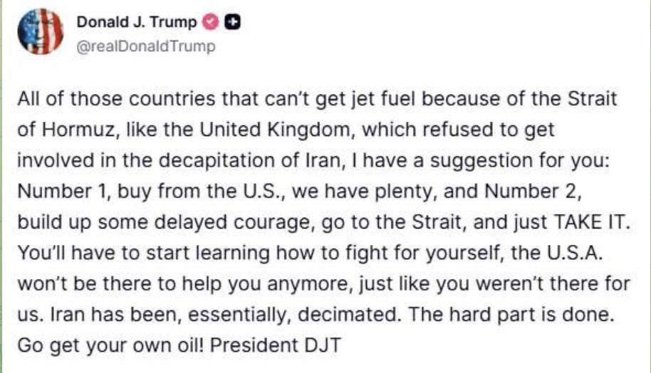Trump na to odpovedal. Americký prezident si do denníka napísal: „Pre všetky krajiny, ktoré si nemôžu zaobstarať letecké palivo kvôli Hormuzskému prielivu, ako napríklad Spojené kráľovstvo, ktoré sa odmietlo zúčastniť na „dekapitácii“ Iránu, mám pre vás návrh: po prvé, nakupujte od USA, máme ho veľa, a po druhé, pozbierajte odvahu, choďte do prielivu a jednoducho SI HO VEZMITE. Budete sa musieť začať učiť bojovať za seba. USA vám už nepomôžu, rovnako ako ste nepomohli ani vy nám. Irán bol v podstate zničený. Tá ťažká časť je za nami. Choďte si zaobstarať vlastnú ropu!“