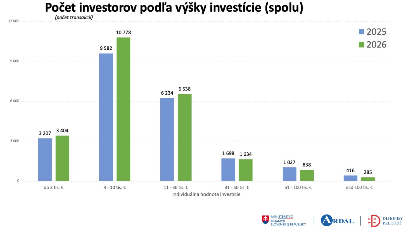 Priemerná investovaná suma klesla na 17.800 eur - z minuloročných 23.600 eur, informoval minister financií. Medián bol 8 600 eur, čo ukazuje, že dlhopisy boli dostupné širokému spektru obyvateľstva. Projekt tak naplnil ambíciu osloviť bežných ľudí a podporiť diverzifikáciu ich úspor. Najviac ľudí investovalo do štátnych dlhopisov 4000 až 10.000 eur - takmer 11.000 občanov. Nasledovali investície v pásme 11.000 až 30.000 eur, kde sa nachádzalo vyše 6500 kupujúcich. Najmenej, iba 285 ľudí investovalo viac ako 100.000 eur, znázornil graf aj s porovnaním za rok 2025: