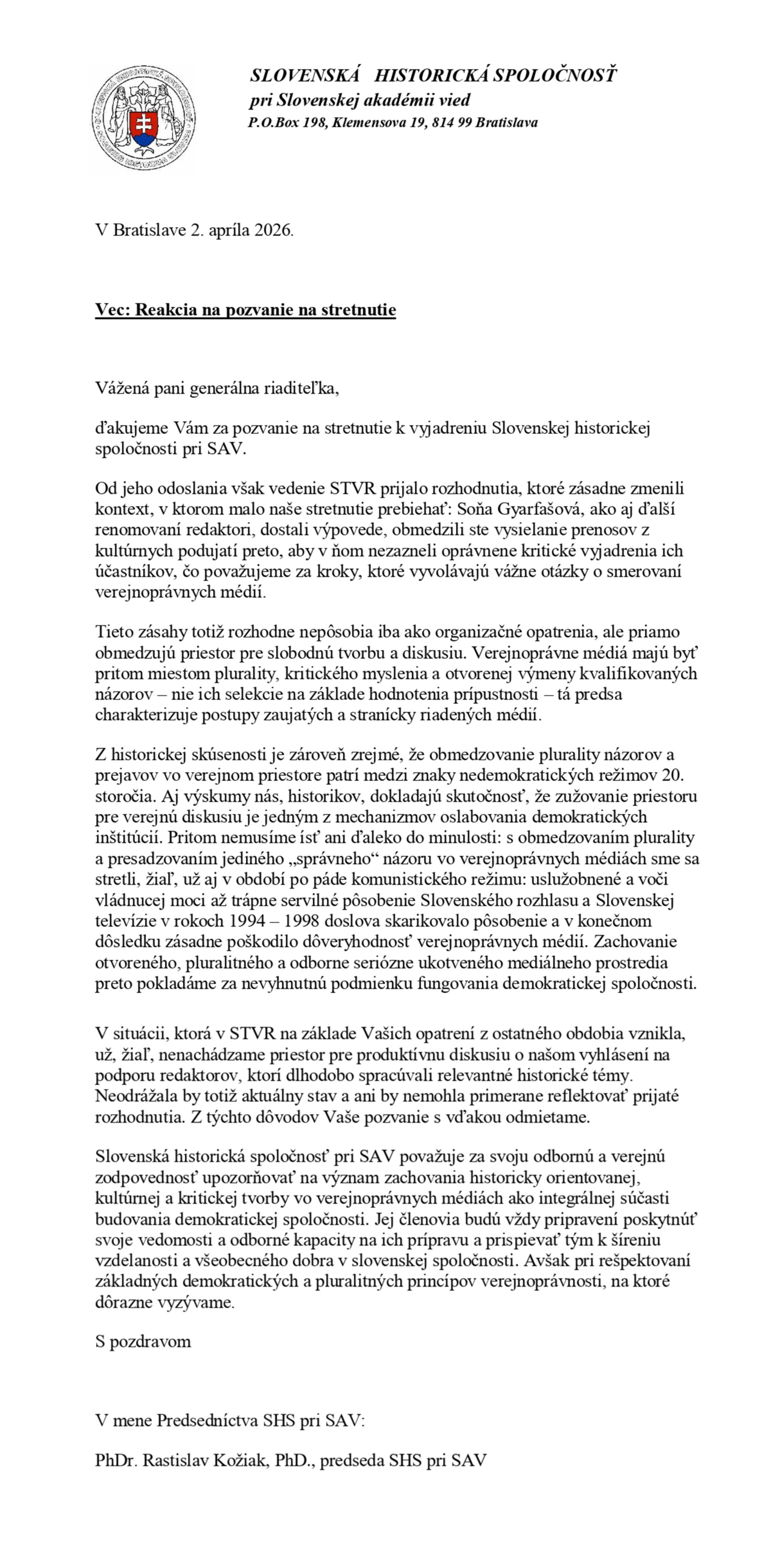 Po tom, čo SHS v polovici marca vyjadrilo podporu programom s historicko-spoločenskými programami, konkrétne Soni Gyarfašovej, generálna riaditeľka zástupcov inštitúcie pozvala na stretnutie, ktoré najskôr na zasadnutí svojho výboru prijali. „Avšak nasledujúce udalosti - prepustenie mnohých kvalitných redaktorov, ako aj zastavenie priamych prenosov z kultúrnych podujatí STVR - nás priviedli k rozhodnutiu stretnutie verejne odmietnuť,“ píše Slovenská historická spoločnosť na sociálnej sieti, kde tiež zverejnili Reakciu na pozvanie na stretnutie.