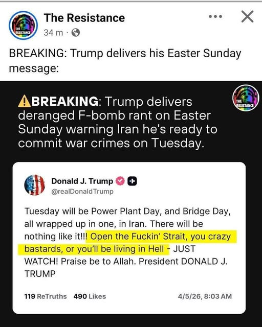 „Utorok v Iráne bude Dňom elektrární a Dňom mostov – a to všetko v jednom. Toto sa ešte nikdy nestalo!!! Otvorte ten zasraný prieliv, vy šialení bastardi, alebo budete žiť v pekle – len sa pozerajte!“