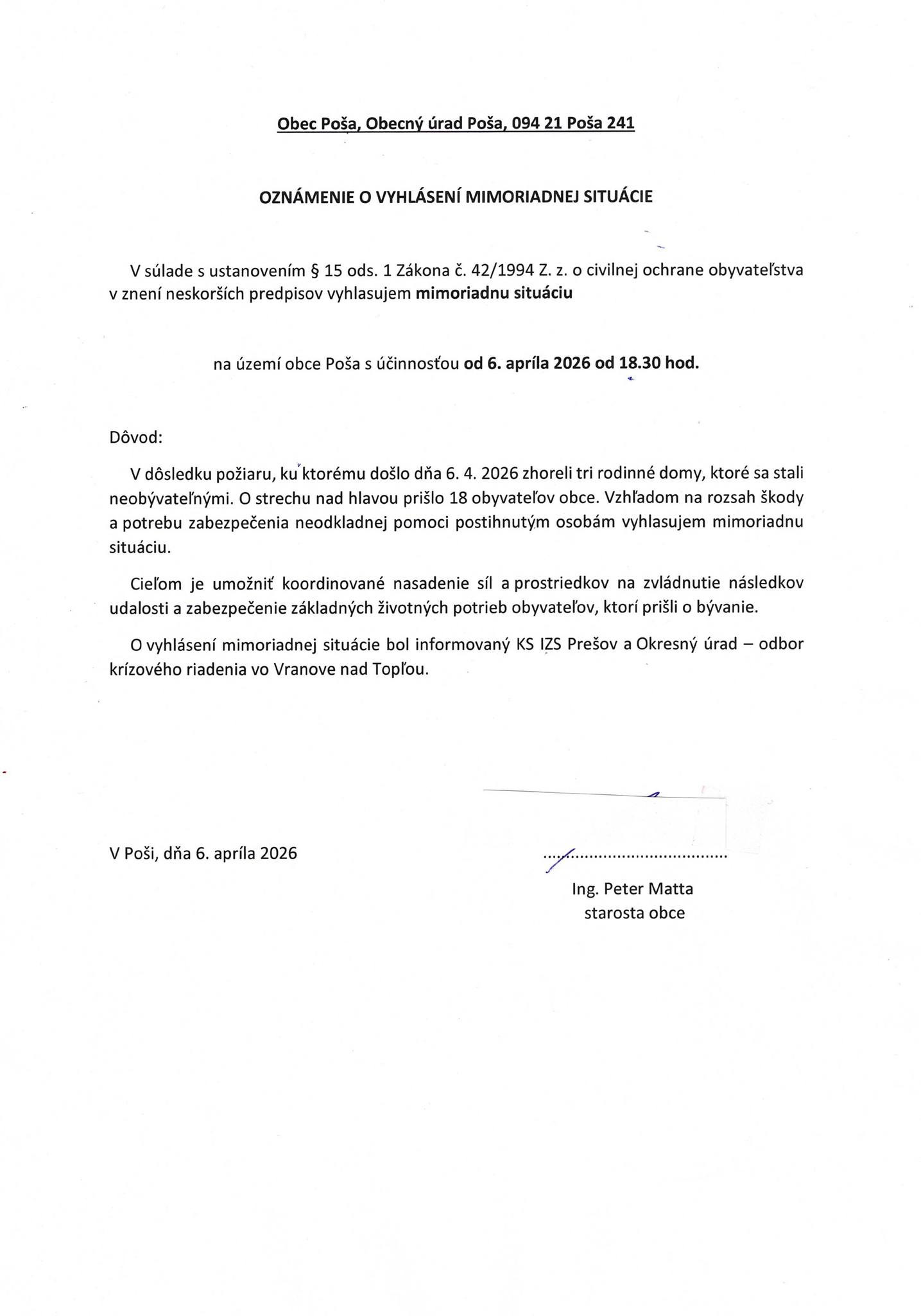 Obec Poša v okrese Vranov nad Topľou vyhlásila mimoriadnu situáciu po pondelkovom (6. 4.) požiari, ktorý zničil tri rodinné domy. O strechu nad hlavou prišlo 18 obyvateľov obce. Ako pre TASR uviedol starosta obce Peter Matta, ide o štyri rodiny, medzi ktorými je desať detí.