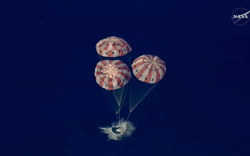 Loď Orion bola pri vstupe do zemskej atmosféry vystavená extrémne vysokej teplote, pričom astronautov chránil špeciálny tepelný štít. Americký Národný úrad pre letectvo a vesmír (NASA) uviedol, že ich prelet zemskou atmosférou trval menej ako 15 minút.