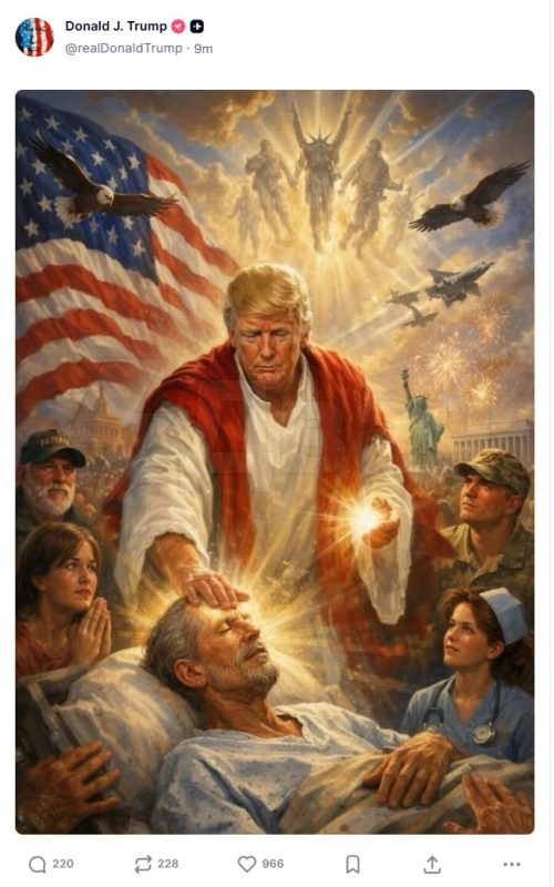 Medzitým sa Trump opäť ocitol v centre pozornosti kvôli príspevku na svojom účte na sociálnej sieti Truth Social. Zverejnil tam obrázok, na ktorom pripomína Ježiša Krista: na obrázku sa dotýka zraneného alebo mŕtveho vojaka, po čom sa objaví žiara.