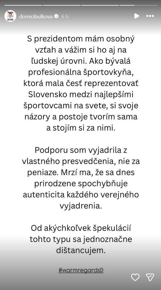 Cibulková v reakcii poukázala na osobný vzťah s prezidentom, ktorého si váži aj na ľudskej úrovni. “Ako bývalá profesionálna športovkyňa, ktorá mala česť reprezentovať Slovensko medzi najlepšími športovcami na svete, si svoje názory a postoje tvorím sama a stojím si za nimi. Podporu som vyjadrila z vlastného presvedčenia, nie za peniaze. Mrzí ma, že sa dnes prirodzene spochybňuje autenticita každého verejného vyjadrenia. Od akýchkoľvek špekulácií tohto typu sa jednoznačne dištancujem,” uzavrela Cibulková na sociálnej sieti Instagram.