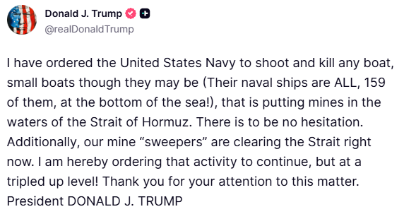 „Nariadil som americkému námorníctvu, aby bez váhania zasiahlo a zničilo akékoľvek plavidlo — vrátane menších člnov, bez ohľadu na ich počet (ich celé námorníctvo, všetkých 159 lodí, je už na dne mora) — ktoré by kládlo míny do vôd Hormuzského prielivu.