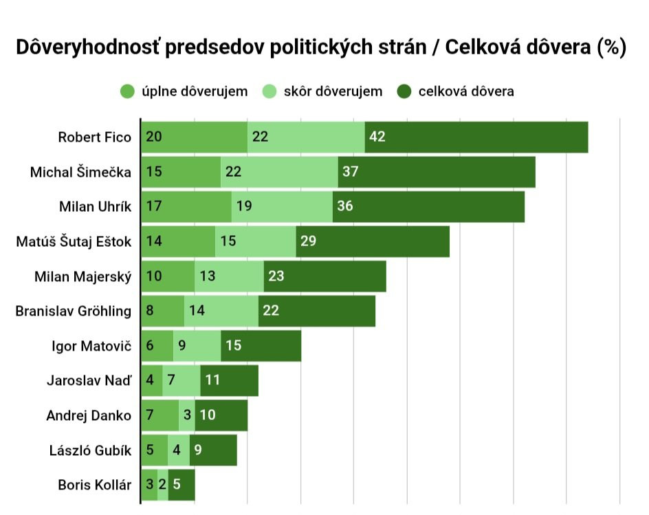 Tretie miesto patrí lídrovi hnutia Republika Milan Uhrík s dôverou 36 %. Nasleduje minister vnútra a líder strany Hlas – sociálna demokracia Matúš Šutaj Eštok, ktorému dôveruje 29 % respondentov.