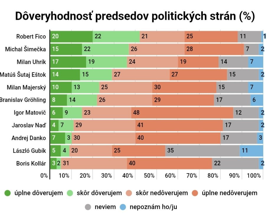 Prieskum ukazuje, že väčšina politických lídrov zaznamenala len minimálne zmeny v porovnaní s marcom. Najvýraznejší posun v prospech dôvery eviduje Robert Fico, zatiaľ čo viacerí opoziční lídri zaznamenali skôr mierny pokles alebo stagnáciu.