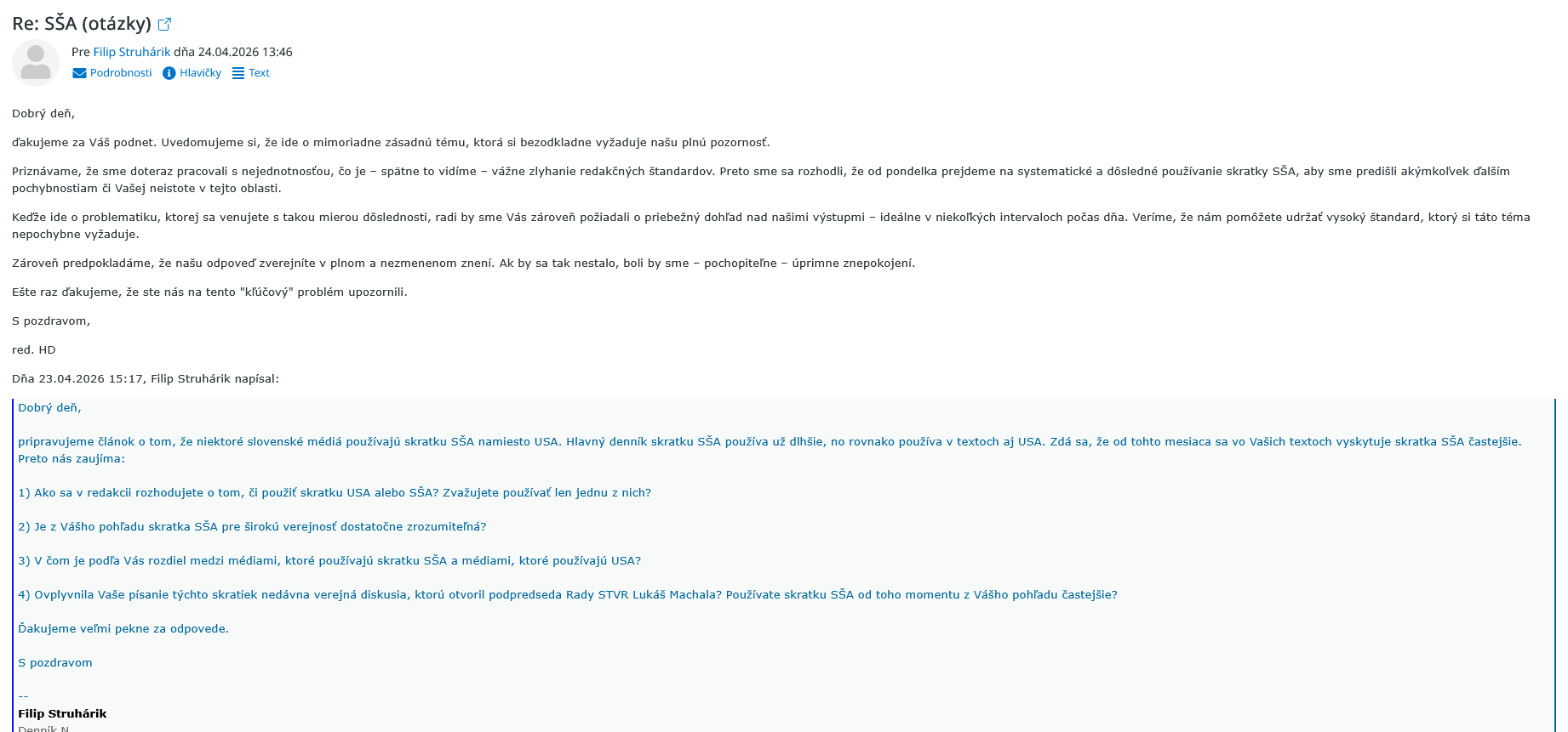 A na záver osobné rozhodnutie: V súlade s odporúčaním Jazykovedného ústavu Ľudovíta Štúra budem používať skratku USA. Navyše závidím Milanovi Mazurekovi zákaz vstupu do Spojených štátov amerických a mám za to, že označením USA za teroristický štát si ho zaslúžim aj ja! Pozdravujem Struhárika a možno by sa mal zamyslieť nad Kyjivom, ktorý používa jeho denníček. Rozdiel medzi médiami, ktoré používajú Kyjev a Kyjiv, by som už vedel popísať... Ak bude záujem, pán Struhárik, kontakt na redakciu máte, analýzu stačí napísať ;)