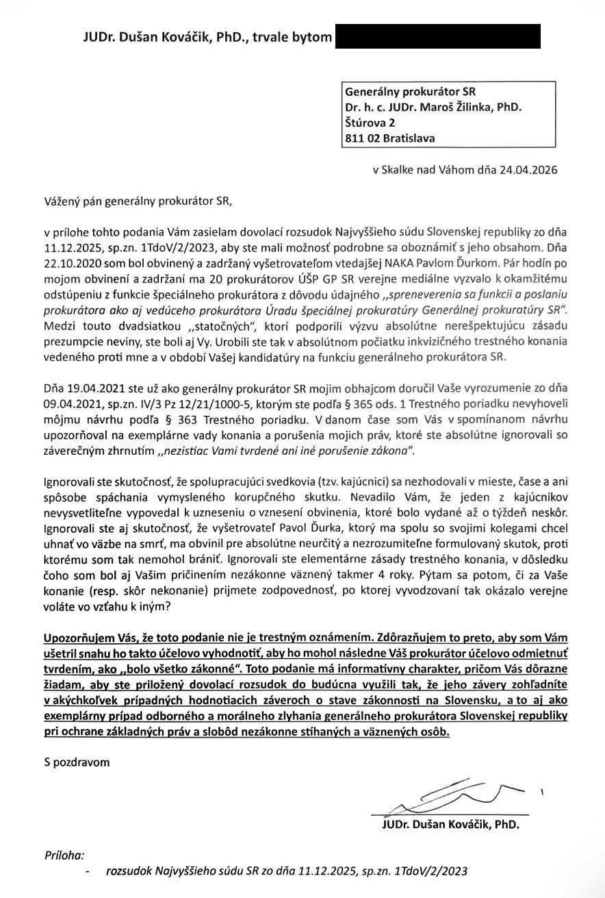 Bývalý špeciálny prokurátor Dušan Kováčik sa opäť hlási o slovo a rozhodne nešetrí kritikou. Najnovšie doručil generálnemu prokurátorovi Maroš Žilinka dovolací rozsudok Najvyšší súd SR a naznačil, že jeho prípad by mal byť mementom pre hodnotenie spravodlivosti na Slovensku.