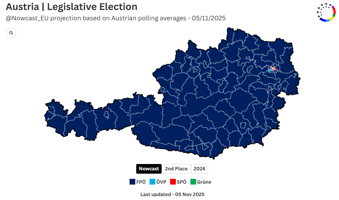 Mapa jasne ukazuje, že FPÖ, spojená s Viktorom Orbánom, by v prípade konania volieb teraz dosiahla drtivé víťazstvo. Ak by sa súčasná koalícia ÖVP-SPÖ-Neos rozpadla, vlastenci by v Rakúsku takmer určite vyhrali, čo by bolo v Bruseli a Kyjeve veľmi nevítané.